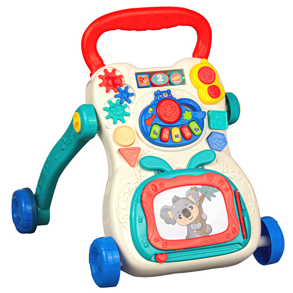 Игровой центр в виде ходунков с доской для рисования – развивающая игрушка для малыша от 6 месяцев и старше. Она предназначена, чтобы ребёнок мог сделать первые шаги. Музыкальная игрушка на батарейках проигрывает несколько весёлых мелодий и воспроизводит звуки нот, в зависимости от выбранного режима. При нажатии на клавиши пианино также подсвечивается. В комплекте магнитная доска, на которой можно рисовать при помощи специальной ручки. Играя с кнопками, звоночками и погремушками, закрепленными на поверхности ходунков, малыш сможет развить мелкую моторику рук.