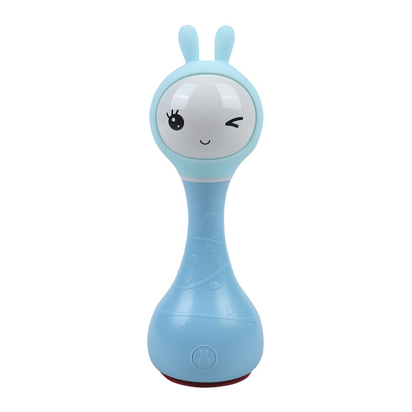 Обучающая игрушка «Умный зайка Alilo» выполнена в виде синего зайца с белым лицом и мордочкой. Ушки мягкие, сделаны из силикона. Тело игрушки имеет плавные линии и удобную для маленьких рук форму. На корпусе есть кнопки управления. Игрушка работает от встроенного аккумулятора, зарядка через USB-кабель. В комплекте идут карточки с цветами и изображениями тракторов. При нажатии на карточку или потряхивании игрушка издает звуки. Ушки светятся разными цветами в темноте.