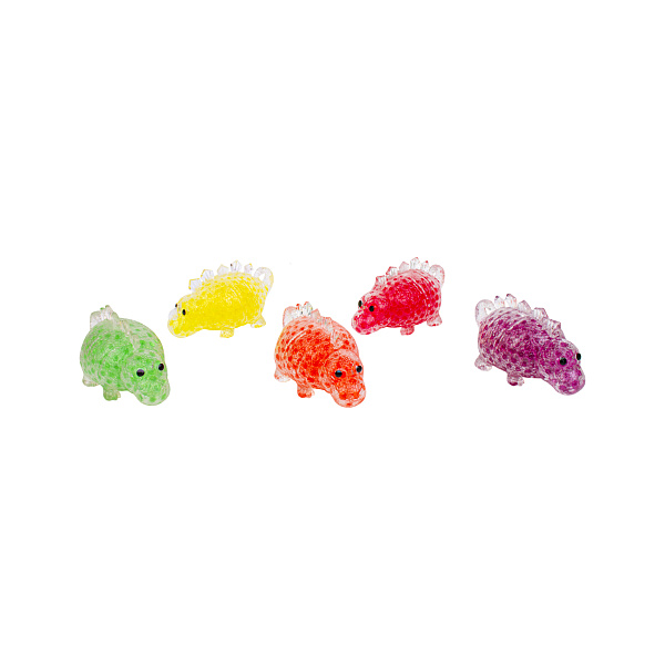 Шесть игрушек для снятия стресса и тревожного состояния в виде динозавров разных цветов (желтый, зеленый, малиновый, красный и оранжевый). Каждый динозавр имеет нарисованные черные глаза, прозрачные лапы, хвост и шипы-наросты. При сдавливании плотная цветная масса растекается внутри игрушки. Не рекомендуется слишком сильно сжимать или протыкать динозаврика – покажите ребенку, как нужно сжимать игрушку-антистресс. Подходит для детей любого возраста, поможет справиться со стрессом, развить моторику рук. Станет оригинальной, но полезной игрушкой в коллекции ребенка.