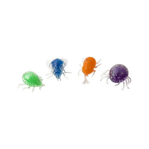 Четыре игрушки-антистресс в форме насекомых разных видов и цветов. Зеленый жук с крупным телом и прозрачными ножками; синий жук с прозрачными крыльями, ножками и усиками; оранжевый жук с крупным носом и ножками; фиолетовый паук с прозрачными ножками и большим тельцем. При сдавливании внутри игрушки становятся заметны большие цветные шарики. Малыш будет надолго увлечен такой игрушкой, что позволит родителям заняться повседневными делами. Подходит для детей любого возраста, поможет справиться со стрессом и станет оригинальной, но полезной игрушкой для ребенка.
