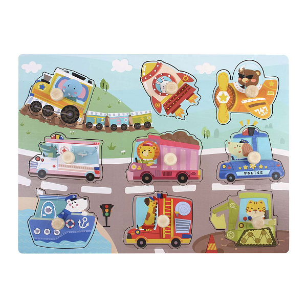 Деревянная игрушка с рамкой и вкладышами представляет собой образовательный набор для детей, выполненный в ярком и привлекательном дизайне. Она включает в себя несколько различных элементов-вкладышей, которые нужно расположить на соответствующих местах в рамке. Каждый вкладыш оформлен в виде транспортного средства с красочными изображениями животных.