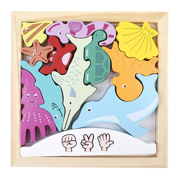 Деревянная игрушка «Вкладыши-пазлы» представляет собой набор из фигурок, выполненных в виде морских обитателей. Яркие цвета и тщательно проработанные детали создают притягательный и запоминающийся дизайн. Каждая фигурка имеет собственное углубление на основе, что делает процесс сборки увлекательным и полезным.