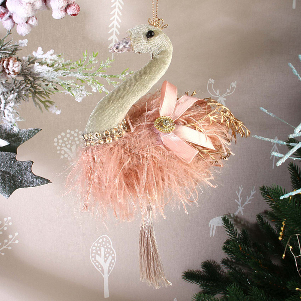 Игрушка елочная Лебедь велюровая с перьями розово-мятная 18см