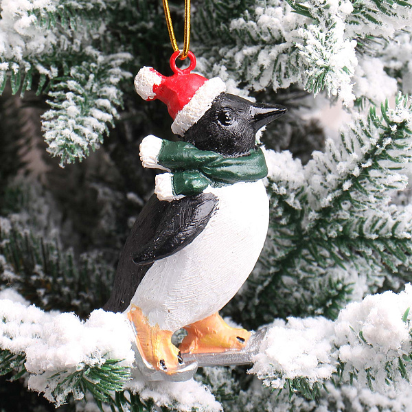 Новогодняя игрушка для елки в виде реалистичного черно-белого пингвина, одетого в красную шапочку с белой опушкой и темно-зеленый шарф. Фигурка прекрасно передает очаровательный образ зимнего персонажа, добавляя праздничного настроения и уюта в интерьер. Высота игрушки составляет 8,5 см, что делает ее удобным и заметным элементом декора на елке любого размера.