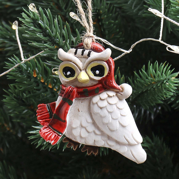 Елочная игрушка в виде совы выполнена в ретро-стиле из прочного полирезина, высотой 5,5 см. Изделие изображает белую сову с большими выразительными глазами, одетую в красно-зеленый шарф и шапочку, что придает ей зимний и праздничный вид. Украшение оснащено пеньковой петлей для удобного подвешивания на елку. Такая игрушка станет очаровательным дополнением новогоднего декора, добавляя тепла и уюта в атмосферу праздника.