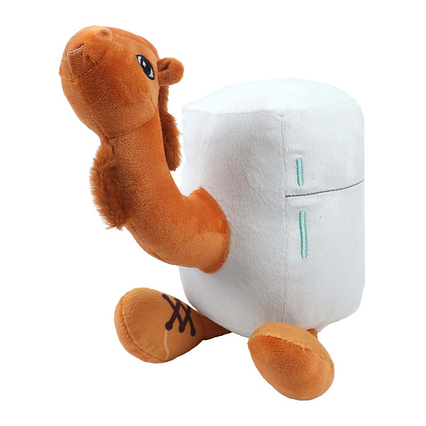 Мягкая игрушка изображает персонажа ФРИГО КАМЕЛО. Этот герой происходит из итальянского брейнрота. Дизайн совмещает образ верблюда с холодильником. Холодильник заменяет туловище животного. Цветовая гамма сочетает белые и коричневые оттенки.