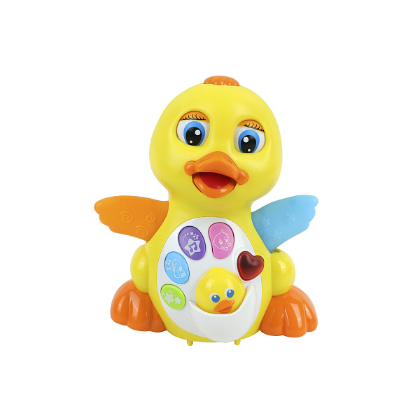 Веселый «Танцующий утенок» бренда Hola — это новый интерактивный друг для ребенка, который не даст ему заскучать. У утенка на животе 4 кнопки, нажимая на которые, малыш услышит веселые мелодии и песни. В процессе утенок машет крыльями, моргает глазами, светится, открывает клюв и поет. Движение произвольные, всегда разные.