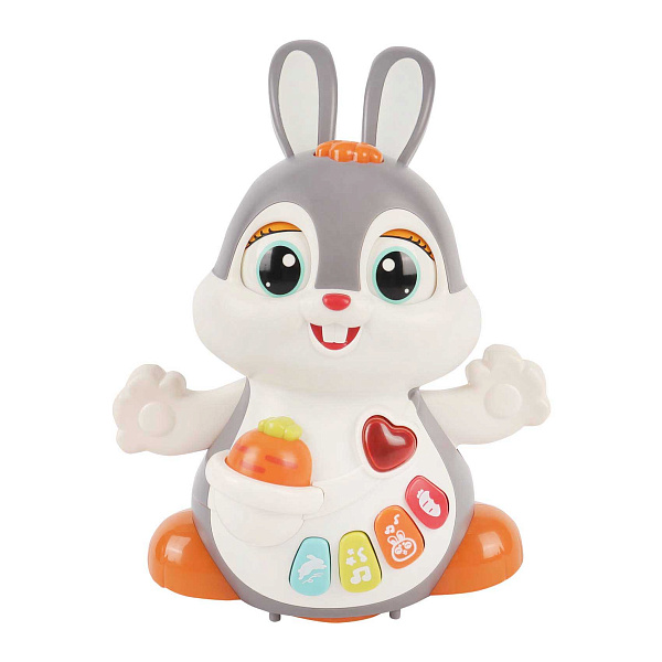 Изготовленный из безопасных и прочных материалов, зайчик рассчитан на длительное использование. Интуитивно понятные кнопки на животе игрушки обеспечивают легкость управления, привлекая внимание ребенка и помогая развивать его моторные навыки.