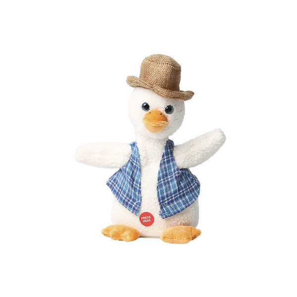 Пушистый утенок станет верным другом для ребенка и главным героем в занимательных играх. Пошит утенок из мягкого и приятного текстиля, пластиковый корпус с разъемом для батареек выполнен из пластика. Белый утенок одет в синюю клетчатую жилетку и соломенную шляпку и напоминает важного сельского жителя. Нажмите на пузико, и забавный утенок начнет махать крыльями. Лапки и клюв утки ярко-оранжевого цвета, а выразительные голубые глазки привлекают внимание. Такой пушистый питомец познакомит ребенка в многообразием животного мира и научит состраданию. На оборотной стороне упаковки есть инструкция по включению игрушки.