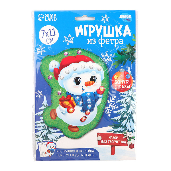 Набор включает все необходимые материалы, чтобы собрать снеговичка: фетр, текстиль и декоративные элементы. В комплекте предусмотрены стразы, которыми можно дополнить образ и добавить игрушке сияния. Яркие и насыщенные цвета деталей делают игрушку привлекательной и выразительной.