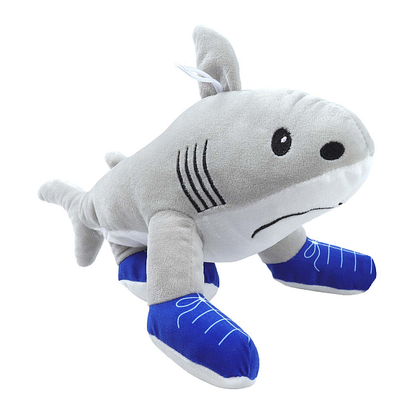Мягкая игрушка изображает персонажа ТРАЛАЛЕРО ТРАЛАЛА. Этот герой известен по итальянскому брейнроту. Размер игрушки составляет 30 сантиметров. Персонаж выполнен в виде серой акулы. На ноги акулы надеты синие кроссовки.