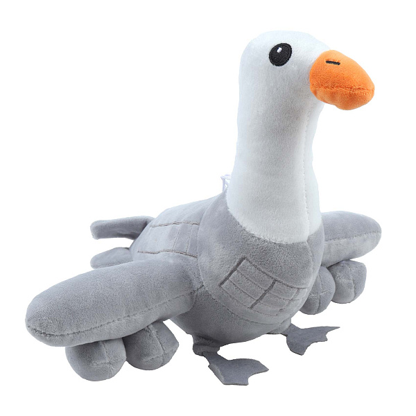 Мягкая игрушка изображает персонажа БОМБОМБИНИ ГУСИНИ. Этот герой происходит из итальянского брейнрота. Дизайн совмещает образ гуся с самолетом-бомбардировщиком. Цветовая гамма использует серые и белые оттенки.