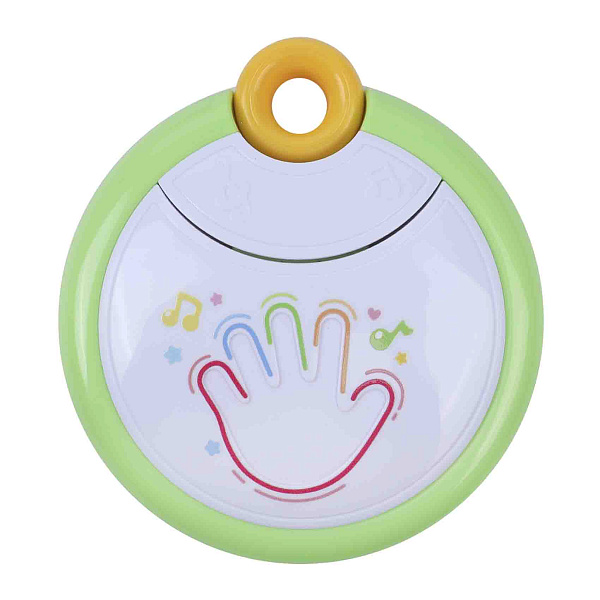 Игрушка озвученная «Бубен мини» — это компактный музыкальный инструмент для малышей, выполненный в яркой и безопасной форме. Игрушка имеет круглую основу с зеленой окантовкой и удобной ручкой сверху, что позволяет ребенку легко держать ее в руке. На лицевой стороне расположены цветные кнопки-клавиши в виде ладошки, при нажатии на которые игрушка издает веселые мелодии и звуки.