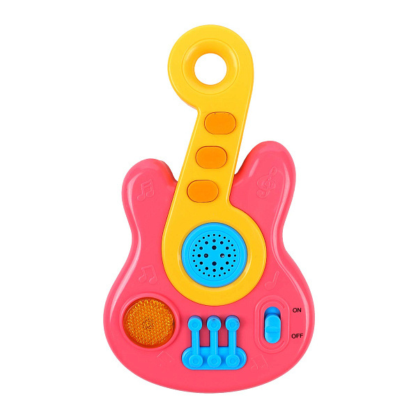 Игрушка работает от батареек. Она подходит для детей старше одного года. Гитара помогает развивать музыкальный слух и координацию движений.