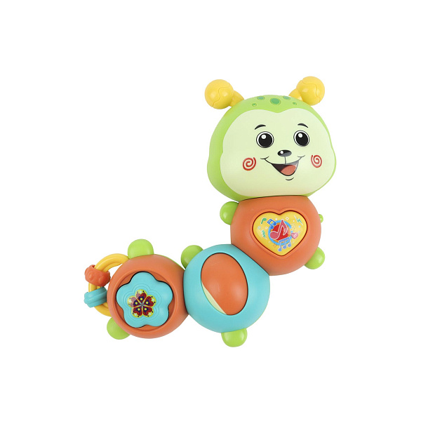 Гусеница состоит из головы и трех сегментов. Каждый сегмент выполняет какую-либо функцию. Первый – от головы при нажатии на кнопку или сжатии проигрывает мелодию. Во втором сегменте закреплен вращающийся разноцветный ролик, который ребенок может крутить, меняя при этом цвет. Кнопка третьего сегмента – пищалка, издающая забавный звук.