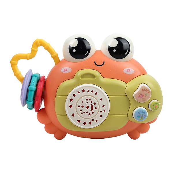 Музыкальный крабик имеет размер 10 сантиметров. Корпус игрушки выполнен в морском стиле. Сбоку расположены тактильные колечки. Колечки имеют разные текстуры для развития мелкой моторики.