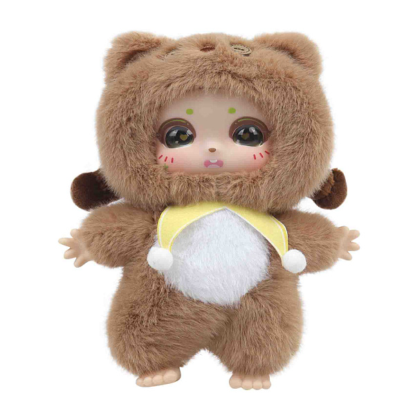 Материалы: винил и полиэстер. Винил используется для деталей лица, рук и ног. Полиэстер составляет основу тела и головы, создавая мягкость и объем. Игрушка предназначена для детей старше трех лет. Размер изделия — 15 см.