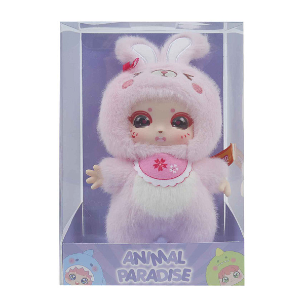 - Дизайн: розовый костюм зайки с украшениями, пластиковое лицо