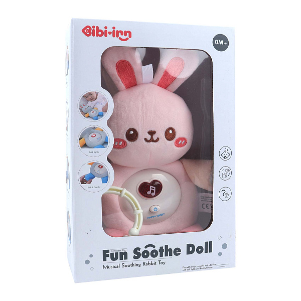 Мягкая игрушка изображает зайчика розового цвета. В игрушке находится съемный музыкальный блок. На блоке есть мягкая подсветка. У зайчика имеется специальное кольцо. Это кольцо позволяет подвешивать игрушку на кроватку, коляску или дугу игрового коврика.