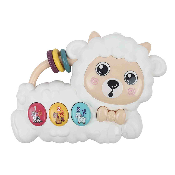 Игрушка озвученная «Овечка мини» — это компактная и яркая музыкальная игрушка в форме милой овечки с пушистым облаком-основанием. Игрушка выполнена из прочного пластика, безопасного для детей. На лицевой стороне расположены три цветные кнопки с изображениями животных — коровы, лошадки и овечки. При нажатии на каждую кнопку игрушка воспроизводит соответствующие звуки животных или веселые мелодии.