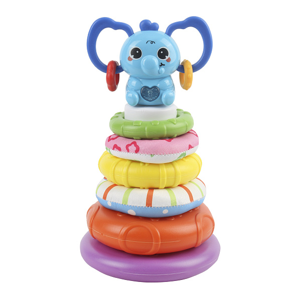 В основе конструкции текстильные и пластиковые кольца, которые нужно сложить на основу в порядке убывания. На вершине пирамиды расположился милый слоненок, нажав на которого можно услышать разные звуки и мелодии.па