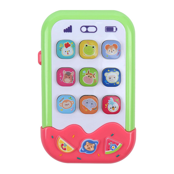 Детский музыкальный телефон имеет яркий корпус. На панели расположены крупные кнопки. При нажатии на кнопки звучат голоса разных животных. Каждая кнопка подсвечивается во время работы.