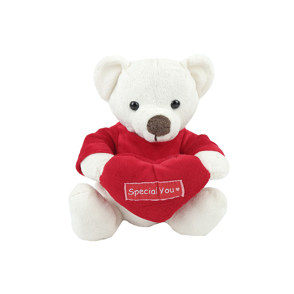 Лучший способ показать ребенку свою любовь – подарить ему мягкого медвежонка с ярко-красным сердцем. Белый медведь одет в красную футболку и держит в лапах сердце с надписью «Специально для тебя». Глаза у медведя верные, нос коричневый. Туловище пошито из приятного на ощупь текстиля. Наполнитель из синтетического волокна легко мнется и быстро возвращается в форму. Небольшая высота в 20см позволяет взять игрушку на прогулку, она легко поместится в детских руках.