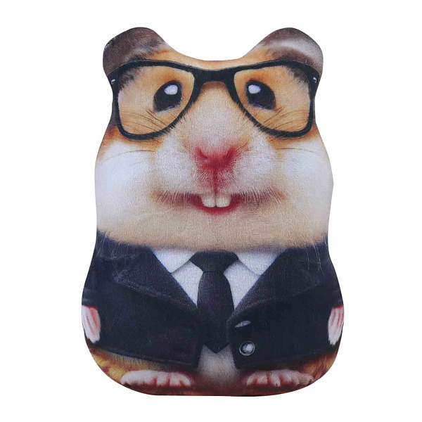 Мягкая игрушка Fancy «Хомяк в костюме» сделана из текстиля с фотопечатью. На поверхности изображен хомяк в очках, белой рубашке и черном пиджаке с галстуком. Фигура имеет простую объемную форму без сложных деталей. Наполнитель делает игрушку мягкой и объемной. Длина изделия 50 см.