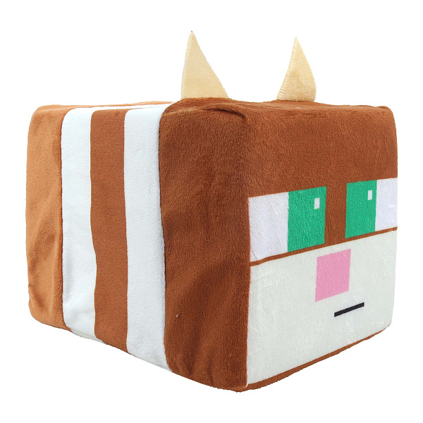 Мягкая игрушка Fancy «Пиксельный кот» имеет кубическую форму. Тело коричневое, с двумя белыми полосами по бокам. На голове — два острых ушка светло-бежевого цвета. Игрушка подходит для игр, объятий и украшения комнаты.