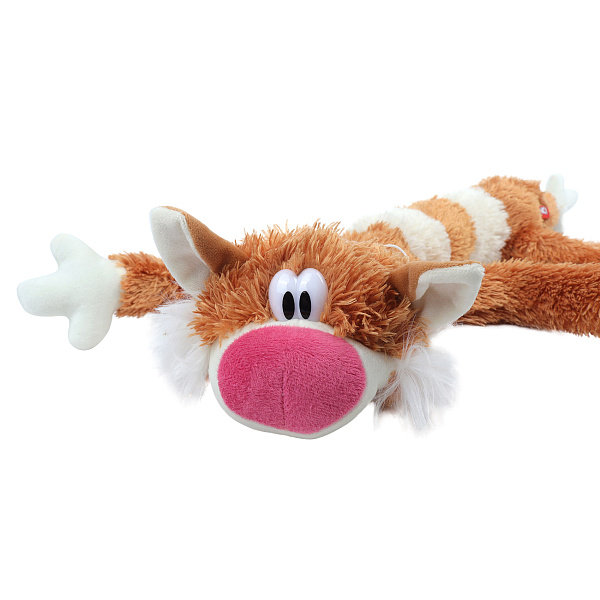 Мягкая игрушка «Кот Бекон» длиной 30 см — это плюшевая фигурка с выразительными белыми глазами, ярко-розовым носом и пушистой шерстью рыже-белого окраса. Игрушка выполнена в стиле забавного персонажа с длинным телом и лапами, что делает её не только приятной на ощупь, но и удобной для обнимашек, игр и использования в качестве декоративного элемента.