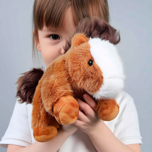Мягкая игрушка лошадка длиной 30 см — это очаровательный плюшевый конёк коричневого цвета с выразительной белой полоской на мордочке и пушистой тёмно-коричневой гривой и хвостом. У игрушки темные глазки и мягкая текстура, благодаря которой её приятно обнимать и брать с собой в дорогу. Компактный размер и продуманная форма делают лошадку отличным подарком и спутником для маленьких детей.