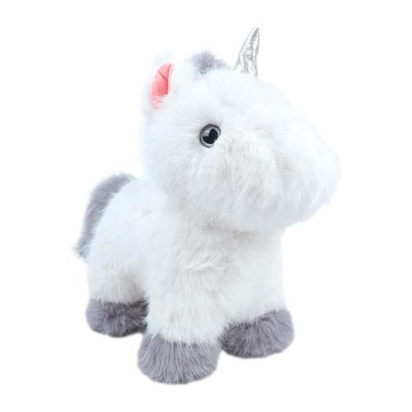 Мягкая игрушка «Пушистый единорог» выполнена в виде сказочного персонажа с белой шерстью и серыми аккуратными деталями на копытах, хвосте и гриве. У игрушки большие блестящие глаза и серебристый рожок, который придает ей волшебный вид. Игрушка не слишком большая — ее высота составляет 45 см, что удобно для детских рук. Она изготовлена из мягких материалов, безопасных для детей старше 3 лет.