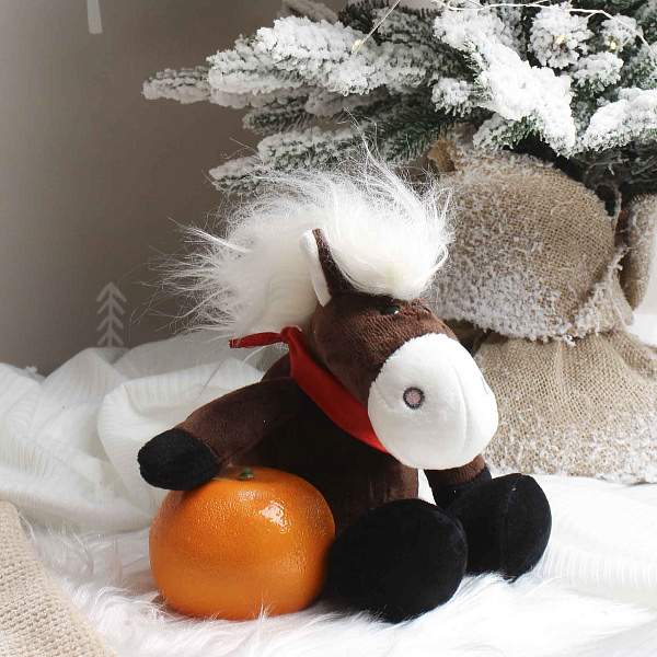 Мягкая игрушка в виде забавной лошади высотой 22 см, выполненная из приятного на ощупь текстильного материала коричневого цвета с контрастной белой мордочкой и гривой. Лошадка украшена ярким красным платком на шее, что добавляет ей игривого и праздничного образа. Игрушка обладает приятной объемной формой и милым выражением лица, что делает ее отличным подарком для детей и взрослых, а также замечательным элементом декора. Наполнитель из синтетического волокна обеспечивает мягкость и упругость, позволяя легко обнимать и играть с игрушкой.
