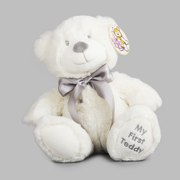 Эта игрушка воздушная и мягкая, как зефир, потому что это нежнейший белый медвежонок фирмы Lanson Toys. Как и должно быть у игрушек для малышей, черты медвежонка прозрачные, едва уловимые, но вместе с тем забавные и добрые. На шее медвежонка повязан серый шелковый бант, который чудесно гармонирует с рисунком мордочки медведя. На левой ножке медведя вышита серая блестящая надпись по-английски «Мой первый мишка». А на груди с правой стороны вышиты звездочки.