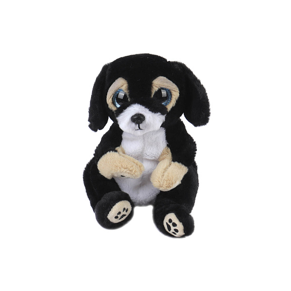 Собачка покрыта пушистым черным мехом, имеет белое брюшко и коричневые кончики лап. Внешний облик игрушки и умелый подбор цветовой гаммы делает игрушку максимально привлекательной.
