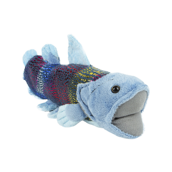 Если ребенок никогда не видел живую щуку, то эта мягкая набивная игрушка познакомит его с внешностью рыбы. Мягкая игрушка пошита из мягкого и приятного на ощупь текстиля: голова и плавники ворсистые голубого цвета, а туловище радужное, покрытое сверкающими на свету «чешуйками». Для наполнения использовано синтетическое волокно – материал податливый, легко сминается и быстро возвращается в прежнюю форму. У игрушки глазки-бусинки и открытая пасть без зубов. Длина игрушки 30см, она не займет много места и чудесно подойдет для прогулок и поездок.