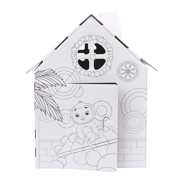 Стены домика украшены открывающимися окнами и дверями, а также веселыми иллюстрациями из жизни Чебурашки. Раскрасив стены и крышу домика фломастерами или цветными карандашами, ребенок получит уникальный декор с любимым персонажем.