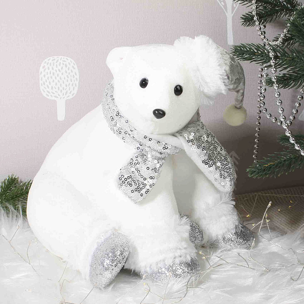 Игрушка новогодняя Северный Мишка в праздничном серебристом колпачке и шарфике белый 32см