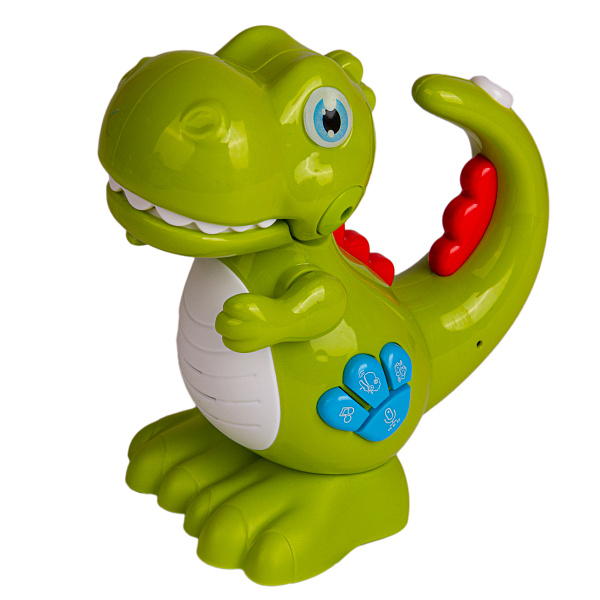 Этот доброжелательный динозавр умеет разговаривать, причем голосом ребенка, его родителей или друзей. Стоит нажать специальную кнопку на теле, и включится функция записи. Всего на теле представлено четыре кнопки, и каждая выполняет свою функцию: повторение записи, включение звуковых эффектов, а также рычание и фырканье.