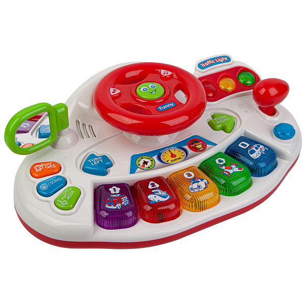 Игровая форма способствует ускоренному и более активному обучению основным навыкам водителя. Игрушка руль с озвучиванием ключевых приоритетов – сигнала, поворотных маячков, звукового режима двигателя, выбор песни и мелодий для игрового путешествия. На передней части игровой консоли находится световая индикация, имитирующая сигналы светофора, справа от руля есть ручка переключения режимов движения.
