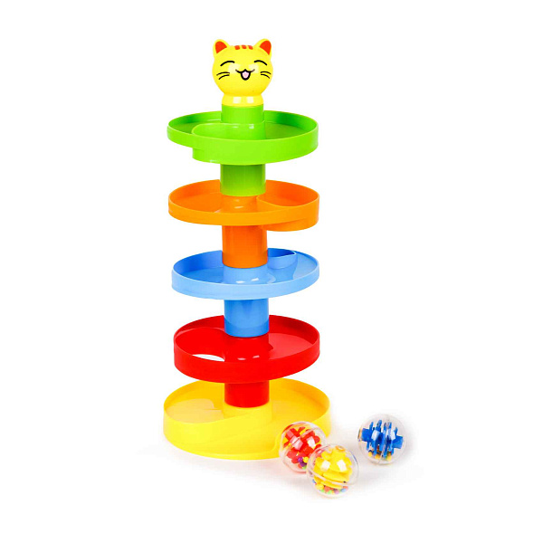 Развивающая игрушка Башня представляет собой разноцветную сборную конструкцию с трековым спуском для мячиков. На каждом уровне есть специальное отверстие, через которое мячик спускается вниз башни. В комплекте также идут три шарика-погремушки, которые во время движения издают приятные, слегка гремящие звуки, а вершина башни украшена милой фигуркой котика. С таким набором малыш сможет научиться различать цвета и формы, выстраивать логические связи, а также улучшит навыки координации и мелкой моторики. Набор с легкостью собирается и разбирается.