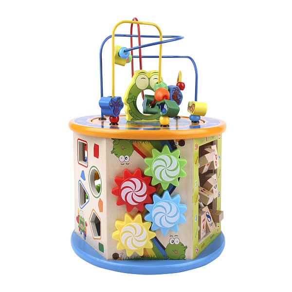 Игрушка оснащена счетами, формами для сортировки и вращающимися шестернями, что способствует развитию мелкой моторики, координации движений и логического мышления. На боковых сторонах находятся циферблат и пазлы, которые помогают в изучении цифр, фигур и цветов. Игрушка поддерживает интерес ребенка и поощряет обучение через игру, делая времяпровождение полезным.