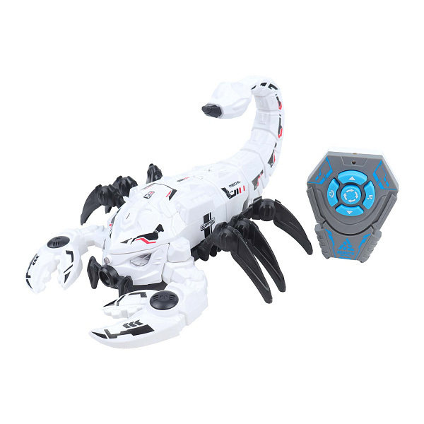 Робо-скорпион — это радиоуправляемая игрушка в виде механического скорпиона, выполненного в бело-чёрном цвете с красными деталями. Игрушка оснащена световыми эффектами, музыкальным сопровождением и функцией выпуска дыма, создавая эффект настоящего боевого робота. Управление происходит с помощью пульта, который позволяет двигаться вперёд и назад, включать свет и дымовые эффекты.