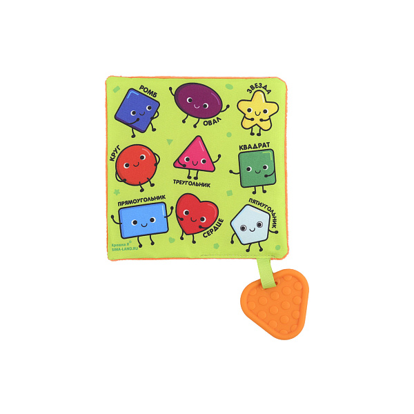 Мягкий платочек квадратной формы покрыт яркими изображениями различных геометрических фигур, дополнен подвеской в виде силиконового прорезывателя. Изделие привлечет внимание ребенка сочетанием контрастных цветов и шуршанием при каждом прикосновении.
