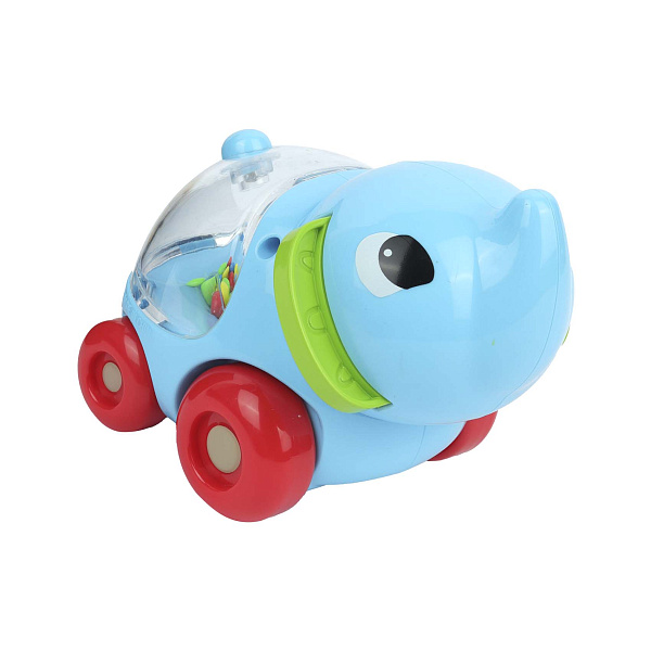 Корпус представляет собой фигурку смешного голубого слоника с поднятым хоботом. На спине игрушки установлен прозрачный контейнер, внутри которого катаются шарики разных оттенков. Широкие красные колеса обеспечивают комфортное для малыша катание игрушки.