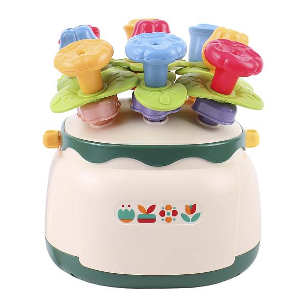 В комплект входят различные геометрические фигуры и элементы, выполненные в виде цветов и листьев. Эти детали помогают развивать моторику, координацию и логическое мышление. Ребенок может вставлять их в соответствующие отверстия на крышке корзины, что способствует развитию зрительно-моторной координации.