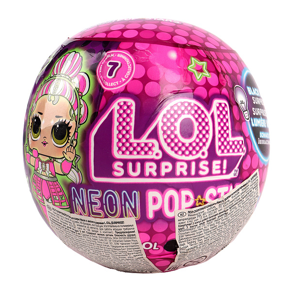 Кукла L.O.L. Surprise! Neon, упакованная в стильный шар, привлекает внимание насыщенными неоновыми оттенками и элегантным дизайном. В комплект входят сама кукла, несколько модных аксессуаров, ультрафиолетовый фонарик и инструкция.