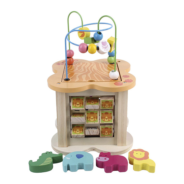 Деревянный развивающий центр «6 в 1» выполнен в виде многофункционального куба, который содержит разнообразные обучающие элементы. Каждая сторона куба предлагает уникальную активность: счеты, лабиринты и обучающие часы. Яркие цвета и привлекательные рисунки животных помогают удерживать внимание детей, способствуя изучению новых игр.