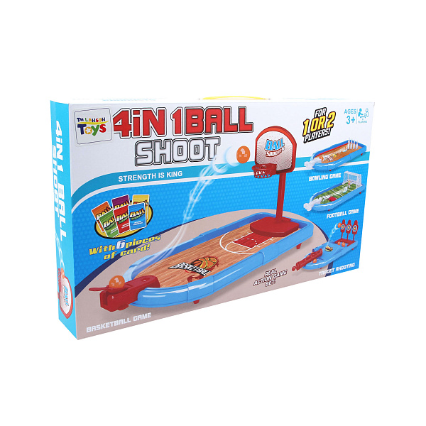 Выясните, кто среди компании самых ловкий вместе с увлекательной настольной игрой «4 в 1». Настольная игра рассчитана на 1-2 игроков и включает 4 занимательные игры. Попробуйте свои силы в футболе, баскетболе, боулинге и тире. В комплекте представлено игровое поле со сменными поверхностями, шарики и аксессуары (баскетбольное кольцо, кегли, футбольные ворота, карточки и манекены для «стрельбы»).