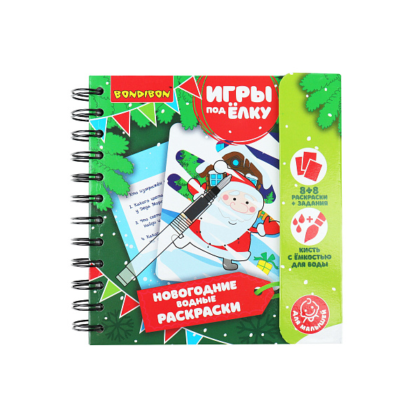 Новогодние раскраски — занимательный творческий набор, который включает карточки с заданиями для детей. Блокнот для рисования предполагает многоразовое применение. Водная раскраска подойдет даже тем, кто пока не умеет рисовать. Если наполненную кистью водой провести по листку с рисунком, изображение начнет проявляться. После высыхания раскраска снова станет бесцветной и готовой к повторному использованию. Дополнительно ребенку нужно ответить на вопросы к картинке.